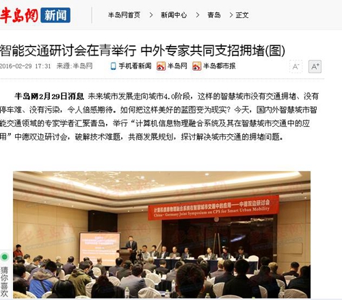 半岛网2月29日消息 未来城市发展走向城市4.0阶段,这样的智慧城市没有交通拥堵、没有停车难、没有污染,令人倍感期待。如何把这样美好的蓝图变为现实?今天,国内外智慧城市智能交通领域的专家学者汇聚青岛,举行“计算机信息物理融合系统及其在智慧城市交通中的应用”中德双边研讨会,破解技术难题,共商发展规划,探讨解决城市交通的拥堵问题。