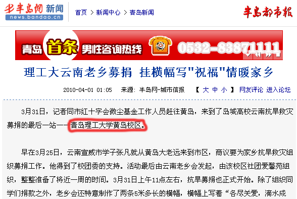 早在3月25日,云南宣威市学子张凡就从黄岛大老远来到市区,商议要为家乡抗旱救灾组织募捐工作。他得到了校团委的支持。活动最后由云南老乡会发起,由该校区社团爱馨苑组织,整整准备了将近一周的时间。3月31日上午11点左右,抗旱募捐也正式开始。除了组织同学们捐款之外,老乡会还特意制作了两条5米多长的横幅,横幅上写着“各尽关爱,滴水成海——让我们一起为西南同胞祈福”。横幅上密密麻麻的满是大家的祝福,其中不少感人的话语。一句“家乡加油”,看得出学子的真情。