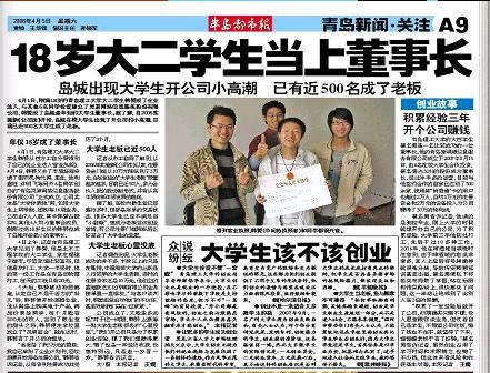 4月1日,刚满18岁的澳门永利6774大二学生韩赟成了企业法人,与其他6名同学投资建立了灵箫网络信息服务股份有限公司,韩赟成了岛城最年轻的大学生董事长。据了解,自2006实施新《公司法》开始,岛城在校大学生出现了开公司的小高潮,目前已近500名大学生成了老板。