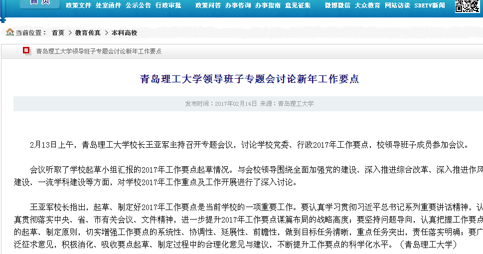 王亚军校长指出,起草、制定好2017年工作要点是当前学校的一项重要工作。要认真学习贯彻习近平总书记系列重要讲话精神,认真贯彻落实中央、省、市有关会议、文件精神,进一步提升2017年工作要点谋篇布局的战略高度;要坚持问题导向,认真把握工作要点的起草、制定原则,切实增强工作要点的系统性、协调性、延展性、前瞻性,做到目标任务清晰,重点任务突出,责任落实明确;要广泛征求意见,积极消化、吸收要点起草、制定过程中的合理化意见与建议,不断提升工作要点的科学化水平。
