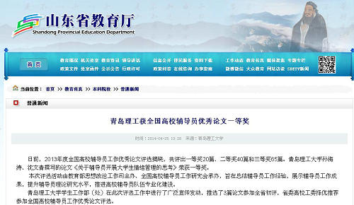 日前,2013年度全国高校辅导员工作优秀论文评选揭晓,共评出一等奖20篇、二等奖40篇和三等奖65篇。澳门永利6774孙海涛、沈文青撰写的论文《关于辅导员开展大学生情绪管理的思考》荣获一等奖。