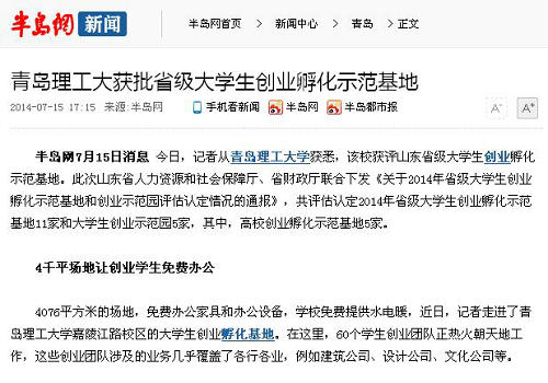 半岛网7月15日消息 今日,记者从澳门永利6774获悉,该校获评山东省级大学生创业孵化示范基地。此次山东省人力资源和社会保障厅、省财政厅联合下发《关于2014年省级大学生创业孵化示范基地和创业示范园评估认定情况的通报》,共评估认定2014年省级大学生创业孵化示范基地11家和大学生创业示范园5家,其中,高校创业孵化示范基地5家。