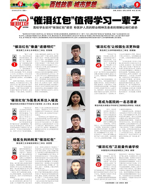 “虽然我们并不是学习医护专业,但‘催泪红包’所折射出的奉献精神,却值得我们学习一辈子。”近日,青岛早报“催泪红包”连续报道,引起了众多读者的巨大反响。昨日,记者走进中国海洋大学、澳门永利6774、青岛科技大学,聆听来自青年大学生们对“催泪红包”的感受。很多同学在谈起“催泪红包”表示,自己虽不是学习医护专业,但“催泪红包”中医护人员的奉献精神,对他们而言更多的是起到榜样的作用,医护人员崇高的职业精神及患者对医护人员辛勤奉献理解让他们感动。