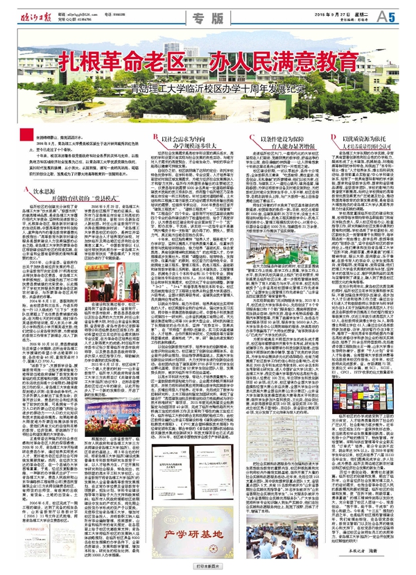 历经十载创业路,豪情壮志谱新篇。临沂校区的创建和发展,顺应了临沂市、山东省经济社会发展对理工类人才的迫切需求,也饱含着革命老区人民的殷殷嘱托和殷切期望;临沂校区的创建和发展,使“百折不挠、刚毅厚重、勇承重载”的理工精神传统得以发扬光大,充分彰显了校区人团结一心、艰苦创业,“想干事、能干事、干成事”的信心和毅力。今年是“十三五”规划的开启之年,也是临沂校区规范管理建设年,我们有理由相信,在各级党委政府、教育主管部门以及社会各界的继续关心和支持下,在校党委行政的坚强领导下,通过校区全体师生员工的共同努力,澳门永利6774(临沂)一定会开创更加灿烂辉煌的明天!