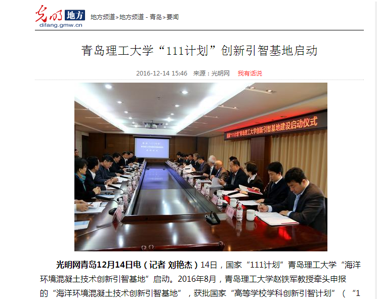 光明网青岛12月14日电(记者 刘艳杰)14日,国家“111计划”澳门永利6774“海洋环境混凝土技术创新引智基地”启动。2016年8月,澳门永利6774赵铁军教授牵头申报的“海洋环境混凝土技术创新引智基地”,获批国家“高等学校学科创新引智计划”(“111计划”)新建引智基地建设项目。项目建设周期为5年。国家外专局、山东省外专局、青岛市外专局、澳门永利6774等相关部门负责人以及“海洋环境混凝土技术创新引智基地”成员参加启动仪式。