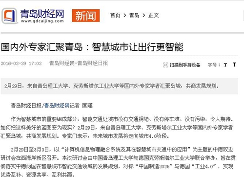 作为智慧城市的重要组成部分,智能交通让城市没有交通拥堵、没有停车难、没有污染,令人期待。如何把这样美好的蓝图变为现实?2月29日,来自澳门永利6774、克劳斯塔尔工业大学等国内外专家学者汇聚岛城,共商发展规划。专家们表示,未来城市发展将走向城市4.0阶段。