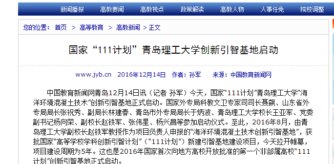 中国教育新闻网青岛12月14日讯(记者 孙军)今天,国家“111计划”澳门永利6774“海洋环境混凝土技术”创新引智基地正式启动。国家外专局科教文卫专家司司长聂飙、山东省外专局局长张祝秀、副局长林建春、青岛市外专局局长于炳波、澳门永利6774校长王亚军、党委副书记杨向荣、副校长赵铁军、张伟星、杨兴昌等参加启动仪式。至此,2016年8月,由澳门永利6774副校长赵铁军教授作为项目负责人申报的“海洋环境混凝土技术创新引智基地”,获批国家“高等学校学科创新引智计划”(“111计划”)新建引智基地建设项目,今天拉开帷幕,项目建设周期为5年。这也是2016年国家首次向地方高校开放批准的第一个非部属高校“111计划”创新引智基地正式启动。