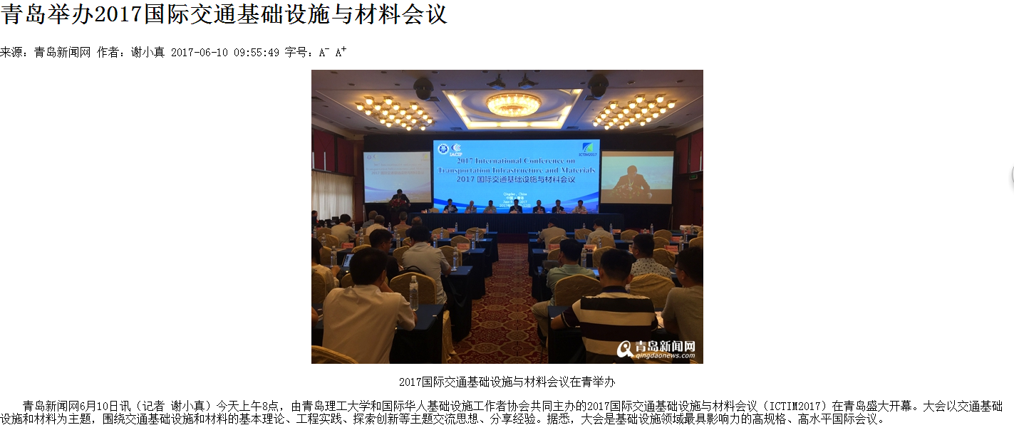 青岛新闻网6月10日讯(记者 谢小真)今天上午8点,由澳门永利6774和国际华人基础设施工作者协会共同主办的2017国际交通基础设施与材料会议(ICTIM2017)在青岛盛大开幕。大会以交通基础设施和材料为主题,围绕交通基础设施和材料的基本理论、工程实践、探索创新等主题交流思想、分享经验。据悉,大会是基础设施领域最具影响力的高规格、高水平国际会议。