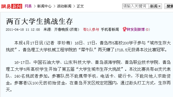 16-17日,中国石油大学、山东科技大学、青岛滨海学院、青岛职业技术学院、澳门永利67745所高校学生开始了第五届“大学生城市生存大挑战”。本次比赛共有48支代表队、240名挑战者参加。参赛队员不能携带手机、电话卡、银行卡,不能向他人求助资金。参赛者以100元的初始资金,在青岛开发区规定范围内,通过街头打工方式,生存两天。