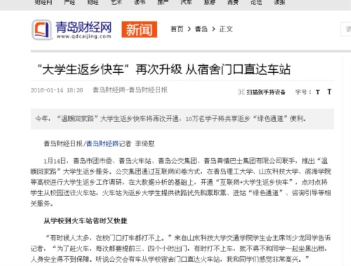 1月14日,青岛市团市委、青岛火车站、青岛公交集团、青岛真情巴士集团有限公司联手,推出“温暖回家路”大学生返乡服务。公交集团通过互联网问卷方式,在澳门永利6774、山东科技大学、滨海学院等高校进行大学生返乡工作调研,在大数据分析的基础上,开通“互联网+大学生返乡快车”,点对点将学生从校园送往火车站,火车站为返乡大学生提供铁路优先购票取票、进站“绿色通道”、咨询引导等相关服务。