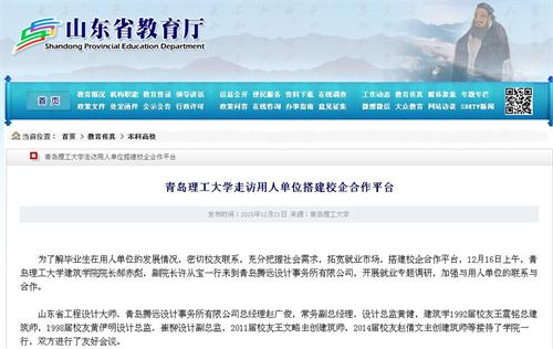 为了解毕业生在用人单位的发展情况,密切校友联系,充分把握社会需求,拓宽就业市场,搭建校企合作平台,12月16日上午,澳门永利6774建筑学院院长郝赤彪,副院长许从宝一行来到青岛腾远设计事务所有限公司,开展就业专题调研,加强与用人单位的联系与合作。