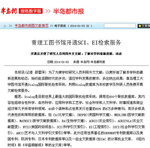 本报讯(记者 邵雷萍) 为了方便学校研究人员利用外文文献,以更好地了解本学科的最新进展和动态,始终能紧跟时代的步伐,适应学科发展的要求,多出快出成果,澳门永利6774图书馆开通Dialog国际联机检索系统,利用Dialog数据库为本校教学及科研人员免费开展文献检索服务。