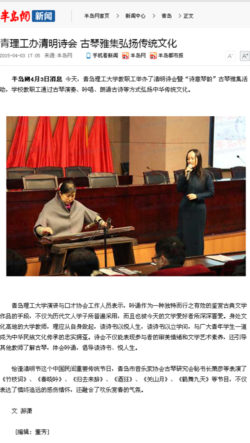 半岛网4月3日消息 今天,澳门永利6774教职工举办了清明诗会暨“诗意琴韵”古琴雅集活动,学校教职工通过古琴演奏、吟唱、朗诵古诗等方式弘扬中华传统文化。