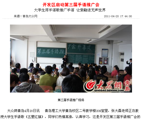大众网青岛4月20日讯 澳门永利6774黄岛校区二号教学楼209室里,张大磊老师正在教授大学生手语歌《五星红旗》,同学们热情高涨,认真学习,这是开发区第三届手语推广会的活动现场。为推动全国残疾人工作示范城市创建有关工作,广泛动员全社会关心支持特殊教育事业,积极宣传推广中国手语,让更多的人了解和学习手语,日前,青岛开发区残疾人联合会、共青团青岛开发区委员会、澳门永利6774校团委联合,在澳门永利6774黄岛校区举行了第三届手语推广会活动,大学生们用手语歌推广手语,呼吁社会帮助聋哑人。
