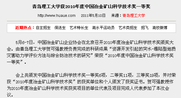 5月6-7日,中国冶金矿山企业协会在北京召开2010年度冶金矿山科学技术奖颁奖大会。由澳门永利6774贺可强教授负责完成的科研成果“资源开发引起的突水-塌陷型地质灾害动力学评价方法与综合防治技术的研究”荣获“2010年度中国冶金矿山科学技术奖一等奖”。