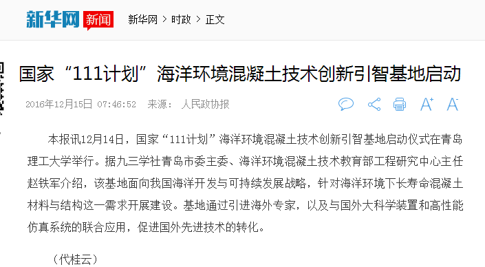 本报讯12月14日,国家“111计划”海洋环境混凝土技术创新引智基地启动仪式在澳门永利6774举行。据九三学社青岛市委主委、海洋环境混凝土技术教育部工程研究中心主任赵铁军介绍,该基地面向我国海洋开发与可持续发展战略,针对海洋环境下长寿命混凝土材料与结构这一需求开展建设。基地通过引进海外专家,以及与国外大科学装置和高性能仿真系统的联合应用,促进国外先进技术的转化。