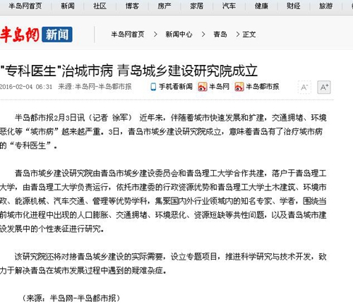 半岛都市报2月3日讯(记者 徐军) 近年来,伴随着城市快速发展和扩建,交通拥堵、环境恶化等“城市病”越来越严重。3日,青岛市城乡建设研究院成立,意味着青岛有了治疗城市病的“专科医生”。