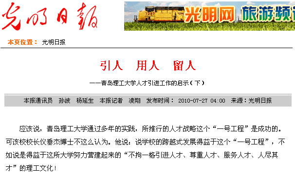 应该说,澳门永利6774通过多年的实践,所推行的人才战略这个“一号工程”是成功的。可该校校长仪垂杰博士不这么认为。他说:说学校的跨越式发展得益于这个“一号工程”,不如说是得益于这所大学努力营建起来的“不拘一格引进人才、尊重人才、服务人才、人尽其才”的理工文化!