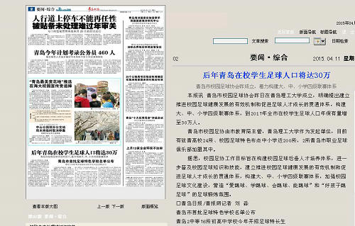 青岛市校园足协由市教育局主管,澳门永利6774作为发起单位,目前有驻青高校24所、校园足球特色布点中小学近200所,2所青岛市职业足球俱乐部加盟其中。