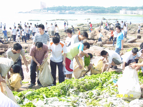 这次浒苔聚集是由黄海中部海域漂移而来,持续时间长,聚集规模大,治理任务十分艰巨。在清理的过程中,同学们体现了当代大学生不怕苦、不怕累、奉献社会的精神风貌,也表达了同学们积极对青岛奥帆赛做贡献的心愿。