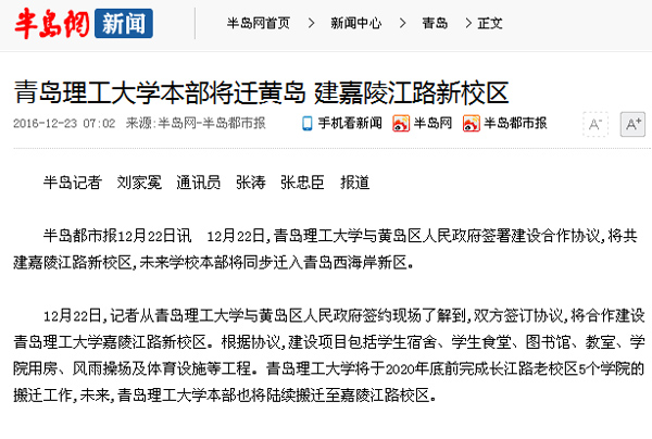 12月22日,记者从澳门永利6774与黄岛区人民政府签约现场了解到,双方签订协议,将合作建设澳门永利6774嘉陵江路新校区。根据协议,建设项目包括学生宿舍、学生食堂、图书馆、教室、学院用房、风雨操场及体育设施等工程。澳门永利6774将于2020年底前完成长江路老校区5个学院的搬迁工作,未来,澳门永利6774本部也将陆续搬迁至嘉陵江路校区。