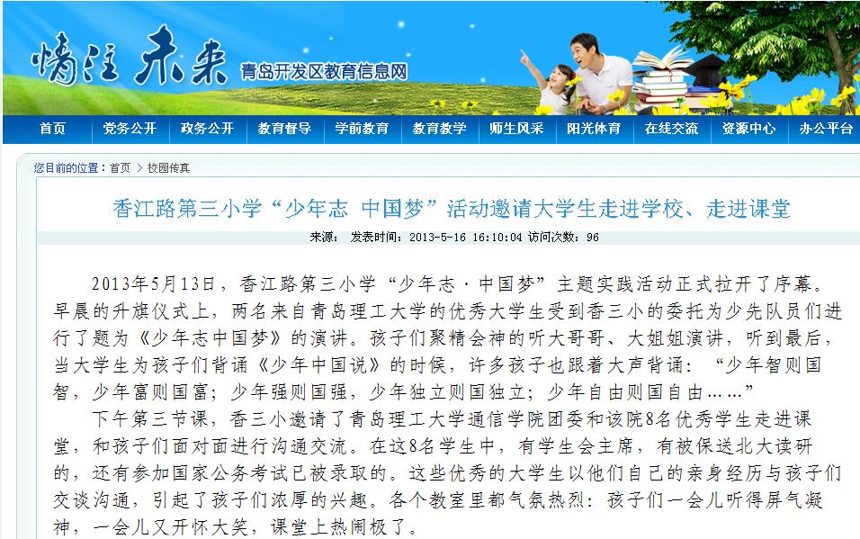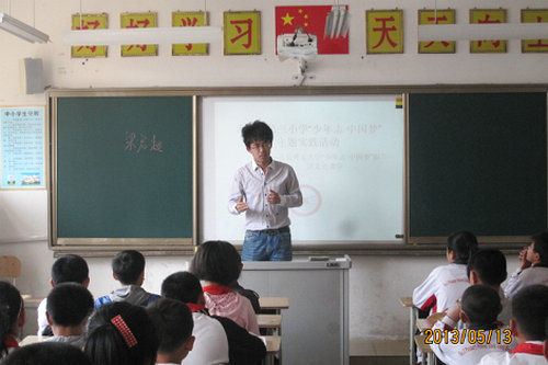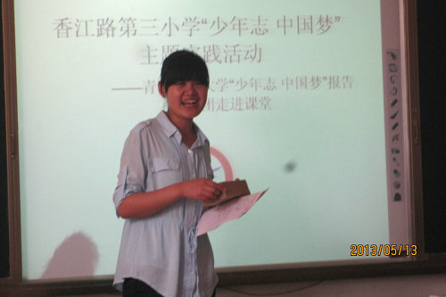 2013年5月13日,香江路第三小学“少年志·中国梦”主题实践活动正式拉开了序幕。早晨的升旗仪式上,两名来自澳门永利6774的优秀大学生受到香三小的委托为少先队员们进行了题为《少年志中国梦》的演讲。孩子们聚精会神的听大哥哥、大姐姐演讲,听到最后,当大学生为孩子们背诵《少年中国说》的时候,许多孩子也跟着大声背诵:“少年智则国智,少年富则国富;少年强则国强,少年独立则国独立;少年自由则国自由……”