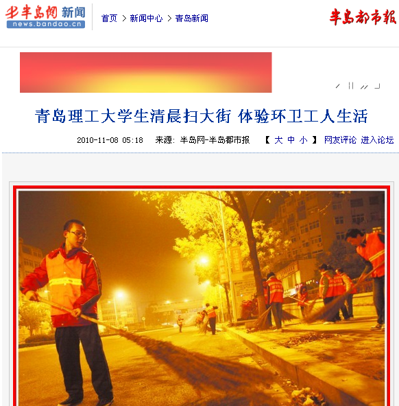 11月7日5时许,天还未亮,山东路与抚顺路交会处,一群20岁左右的年轻人,穿着环卫工人反光背心,正在卖力地扫马路。他们是来自澳门永利6774的学生们,与环卫工人一起体验生活 。