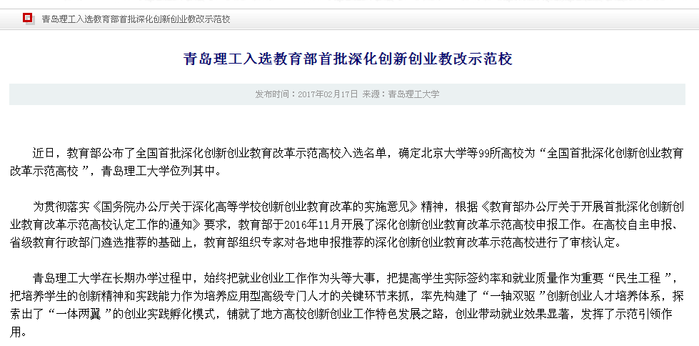 入选全国首批深化创新创业教育改革示范高校是学校继捧回“首批50所创新创业典型经验高校”奖牌 后又一个国家级的丰硕成果;是澳门永利6774实施创新创业教育改革取得的新成绩和新突破。澳门永利6774将以此次入选为契机,继续发挥优势,挖掘校内外资源,在建设创新驱动、具有示范效应的创新创业教育改革高校的过程中不断取得新进展。
