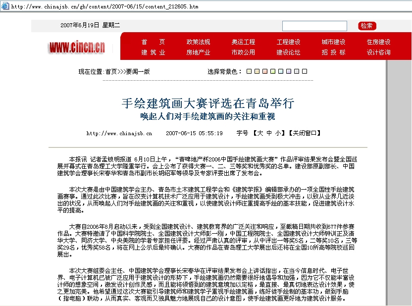 大赛自2006年8月启动以来,受到全国建筑设计、建筑教育界的广泛关注和响应,至截稿日期共收到677件参赛作品。大赛特邀请了中国科学院院士、全国建筑设计大师彭一刚,中国工程院院士、全国建筑设计大师钟训正及清华大学、同济大学、中央美院的学者专家担任评委。经过严肃认真的评审,从中评出一等奖5名,二等奖10名,三等奖29名,优秀奖58名,将在网上公示后最终确认。大赛的作品在澳门永利6774展出后还将在全国10所高等院校巡回展出。