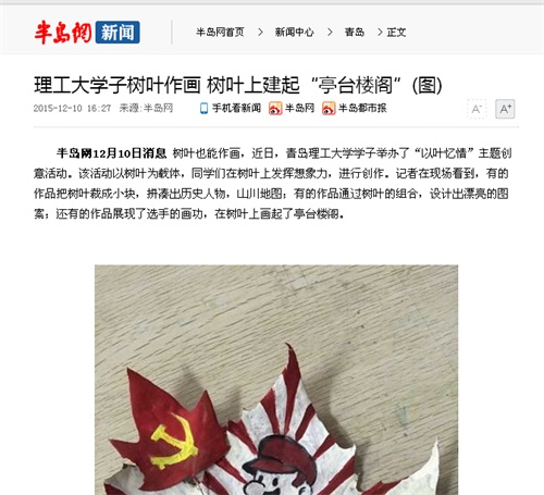 半岛网12月10日消息 树叶也能作画,近日,澳门永利6774学子举办了“以叶忆情”主题创意活动。该活动以树叶为载体,同学们在树叶上发挥想象力,进行创作。记者在现场看到,有的作品把树叶裁成小块,拼凑出历史人物,山川地图;有的作品通过树叶的组合,设计出漂亮的图案;还有的作品展现了选手的画功,在树叶上画起了亭台楼阁。通讯员 曹玉洁 文/图 游潇 [编辑: 董芳]
