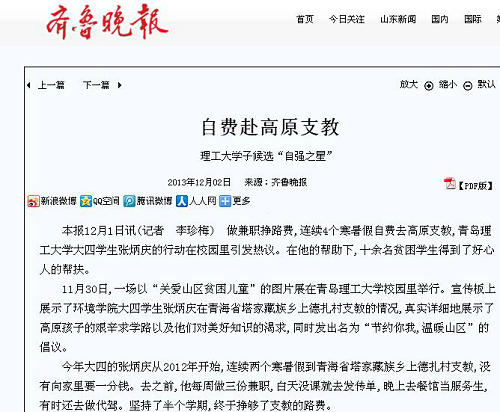 今年大四的张炳庆从2012年开始,连续两个寒暑假到青海省塔家藏族乡上德扎村支教,没有向家里要一分钱。去之前,他每周做三份兼职,白天没课就去发传单,晚上去餐馆当服务生,有时还去做代驾。坚持了半个学期,终于挣够了支教的路费。