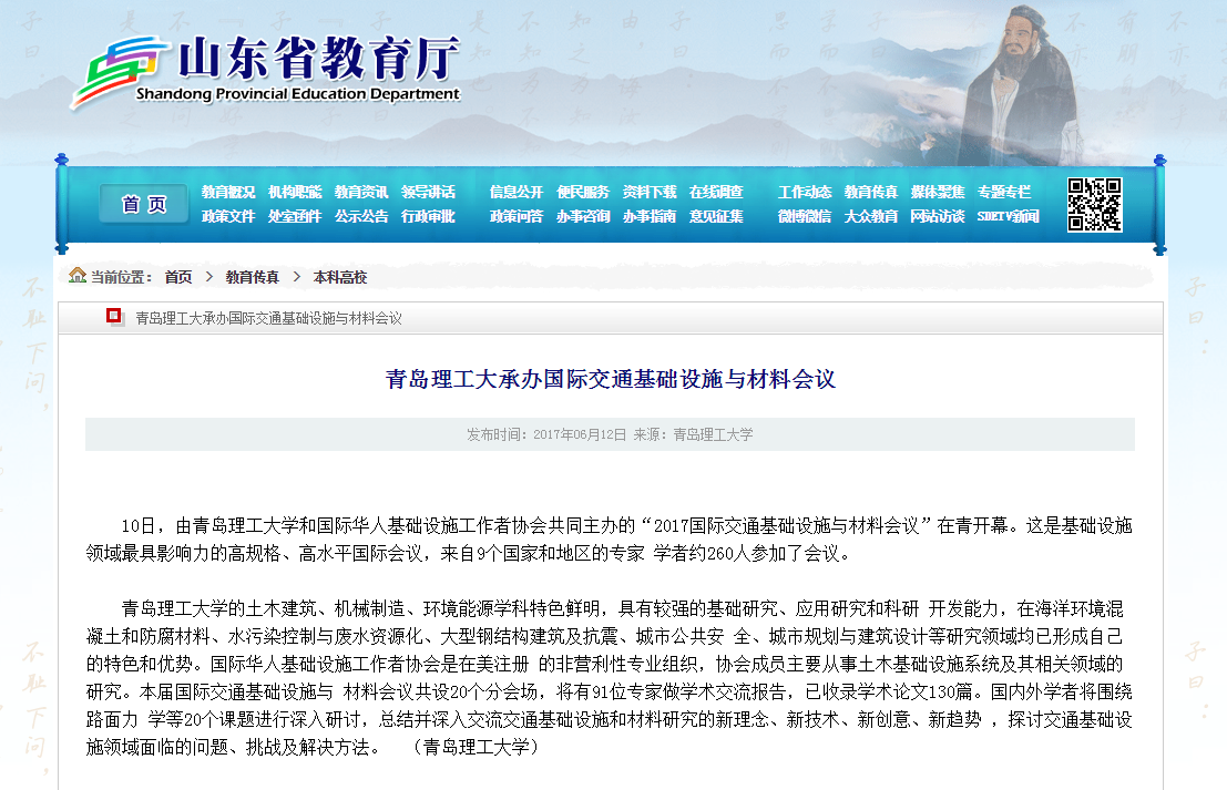 10日,由澳门永利6774和国际华人基础设施工作者协会共同主办的“2017国际交通基础设施与材料会议”在青开幕。这是基础设施领域最具影响力的高规格、高水平国际会议,来自9个国家和地区的专家 学者约260人参加了会议。