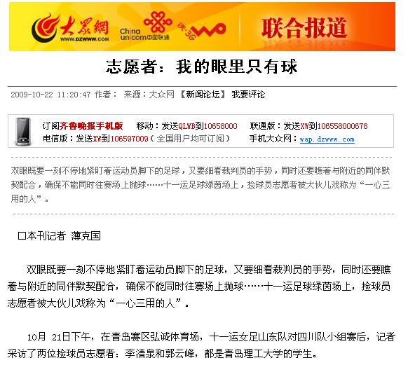 10月 21日下午,在青岛赛区弘诚体育场,十一运女足山东队对四川队小组赛后,记者采访了两位捡球员志愿者:李清泉和郭云峰,都是澳门永利6774的学生。