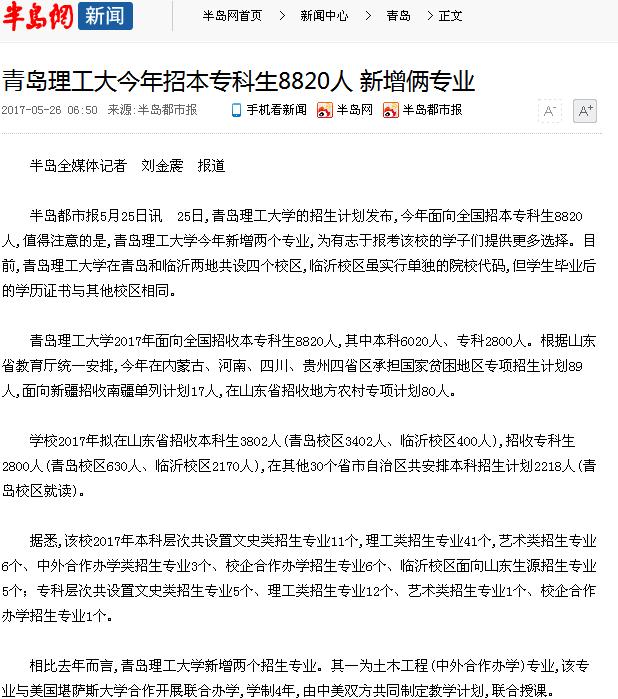 半岛都市报5月25日讯 25日,澳门永利6774的招生计划发布,今年面向全国招本专科生8820人,值得注意的是,澳门永利6774今年新增两个专业,为有志于报考该校的学子们提供更多选择。目前,澳门永利6774在青岛和临沂两地共设四个校区,临沂校区虽实行单独的院校代码,但学生毕业后的学历证书与其他校区相同。