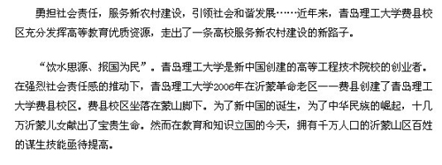 勇担社会责任,服务新农村建设,引领社会和谐发展……近年来,澳门永利6774费县校区充分发挥高等教育优质资源,走出了一条高校服务新农村建设的新路子。