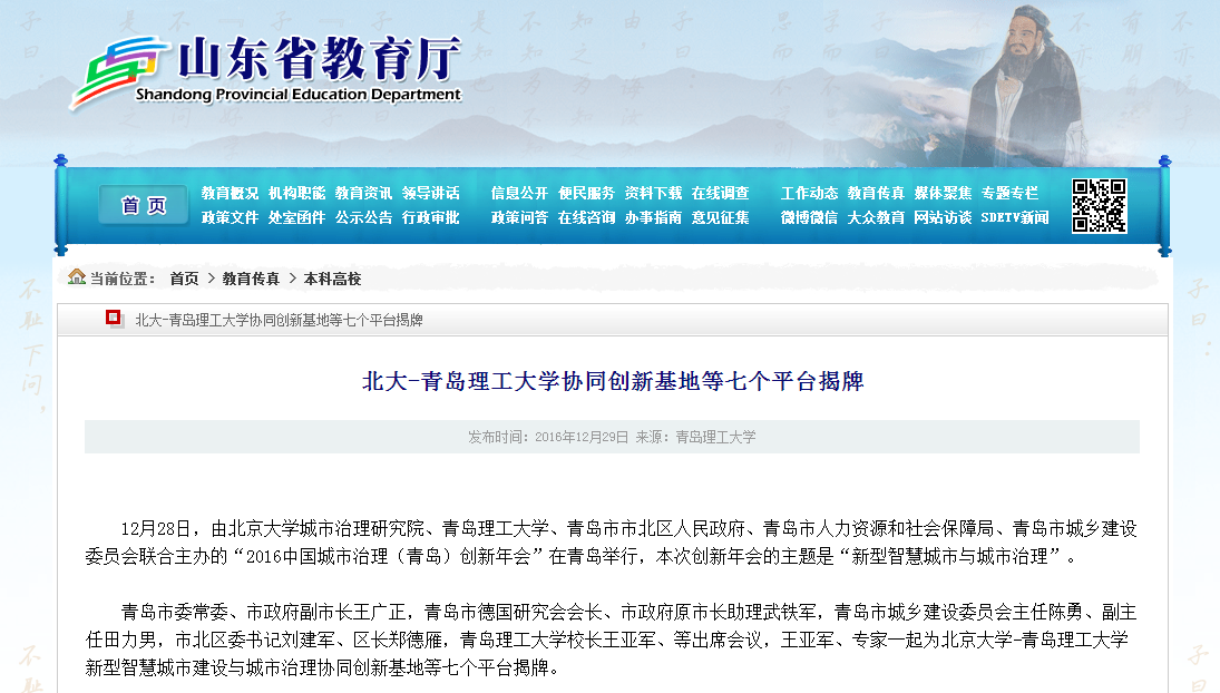 12月28日,由北京大学城市治理研究院、澳门永利6774、青岛市市北区人民政府、青岛市人力资源和社会保障局、青岛市城乡建设委员会联合主办的“2016中国城市治理(青岛)创新年会”在青岛举行,本次创新年会的主题是“新型智慧城市与城市治理”。