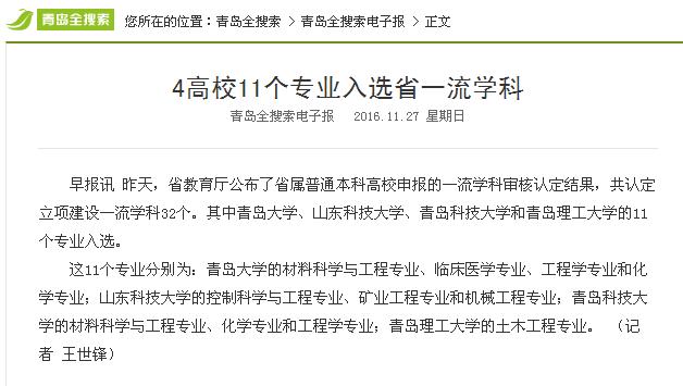 早报讯 昨天,省教育厅公布了省属普通本科高校申报的一流学科审核认定结果,共认定立项建设一流学科32个。其中青岛大学、山东科技大学、青岛科技大学和澳门永利6774的11个专业入选。