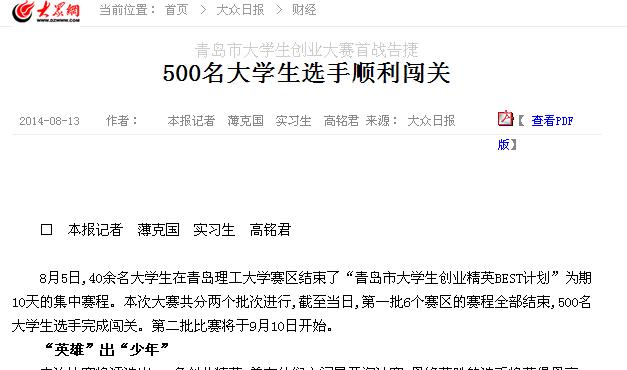 8月5日,40余名大学生在澳门永利6774赛区结束了“青岛市大学生创业精英BEST计划”为期10天的集中赛程。本次大赛共分两个批次进行,截至当日,第一批6个赛区的赛程全部结束,500名大学生选手完成闯关。第二批比赛将于9月10日开始。