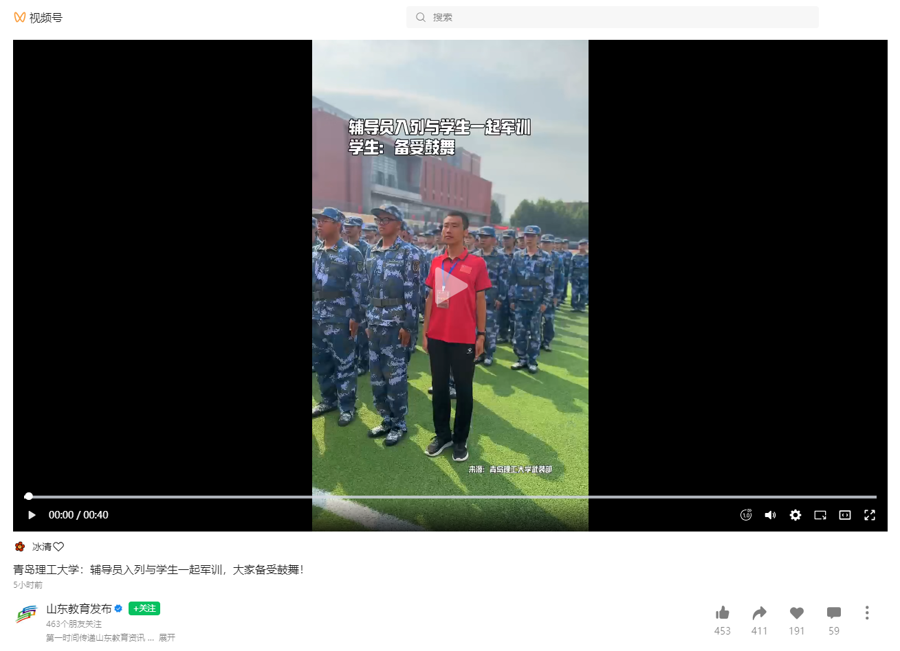 山东教育发布视频号:澳门永利6774:辅导员入列与学生一起军训,大家备受鼓舞!
