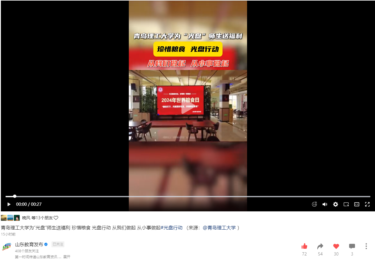 山东教育发布视频号:澳门永利6774为“光盘”师生送福利