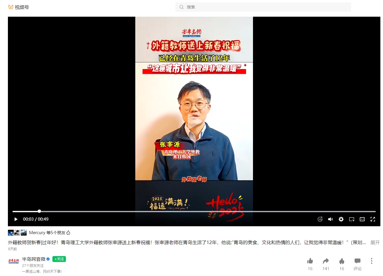 半岛网官微视频号:外籍教师贺新春|过年好!澳门永利6774外籍教师张宰源送上新春祝福!
