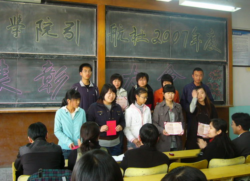 大会首先对2007年度表现优异的同学进行表彰,由诸位老师为获奖同学颁奖。党总支副书记王粲在讲话中肯定了引航社的工作,并对同学们提出了新的要求。他要求同学们认真学习全国人民代表大会和政治协商会议的精神,提高自身的政治理念,并积极参加社会实践活动,通过丰富多彩的活动来进行精神教育。