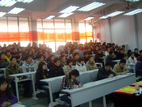 大会在庄严肃穆的国歌声中拉开了帷幕。首先由王新书记宣布了获奖名单,对获得校级优良学风班标兵班的班级以及在“金蝶杯”ERP大赛、心理运动会、聚焦法庭、制图知识竞赛中获得优异成绩的集体和个人进行了表彰。随后肖书记发表了讲话,他总述了我院近年来的发展情况,并结合“评估”工作对我院同学的表现给予了高度肯定。随后他着重强调了考风考纪问题,并以事例阐述了考试作弊的严重后果。他指出,期末考试即将到来,全体同学要端正态度,刻苦学习,以自己最真实的成绩回报父母和学校,坚决杜绝考试作弊行为。接下来,学生代表向同学发出诚信应考倡议,郑重号召全院学生遵守考场秩序,杜绝作弊。最后邵院长对大会作了简短而精彩的总结,赢得观众的阵阵掌声,至此大会圆满结束。