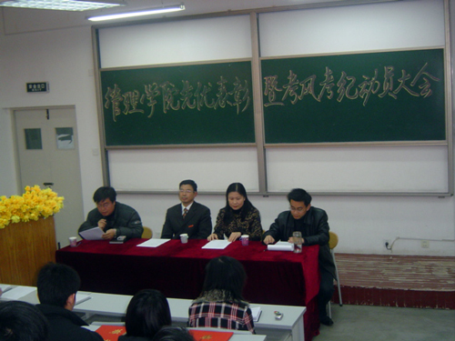 为了表彰在各项活动中取得优异成绩的集体和个人,明确考风考纪,近日,管理学院在二教阶401隆重召开了“管理学院先优表彰暨考风考纪动员大会”。管理学院院长邵军义、党总支书记王新、副书记肖学斌、团总支书记于利俊等出席了本次大会。