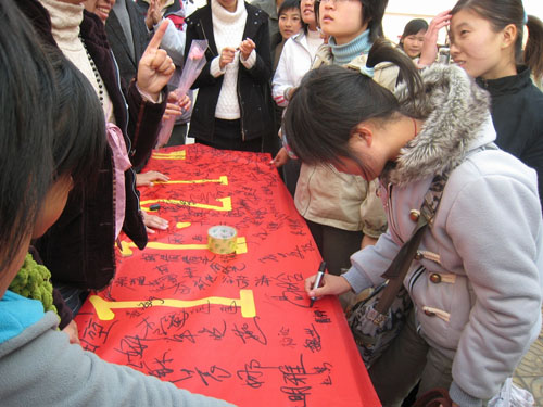 实践部“世界问候日”活动分为两部分——校内活动与校外活动。此次活动由经选拔胜出的7名形象大使和19名志愿者参加。校内活动于11点45分到12点30分在学校二号食堂一楼门口举行,活动人员为同学们送上了康乃馨和亲手折叠的千纸鹤,同时也将对同学们的问候、关怀、祝福送给了他们。另外,组织了签名活动,同学们纷纷将自己的名字签写在横幅上。校外活动从13点一直持续到14点。活动人员在井冈山路以同样的方式将他们的祝福传递给了陌生人。