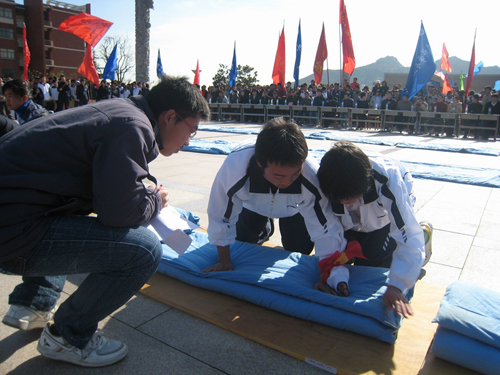 9点,叠被大赛正式开始,大赛分三人叠被比质量、单人叠被比质量比数量、“两人三手”比质量三个环节。这次大赛的评委为各个参赛方学院的学生会主席以及四名青岛边防大队武警战士,在核算总分期间,武警战士为同学们进行了精彩的叠被表演,引来同学们阵阵掌声。
