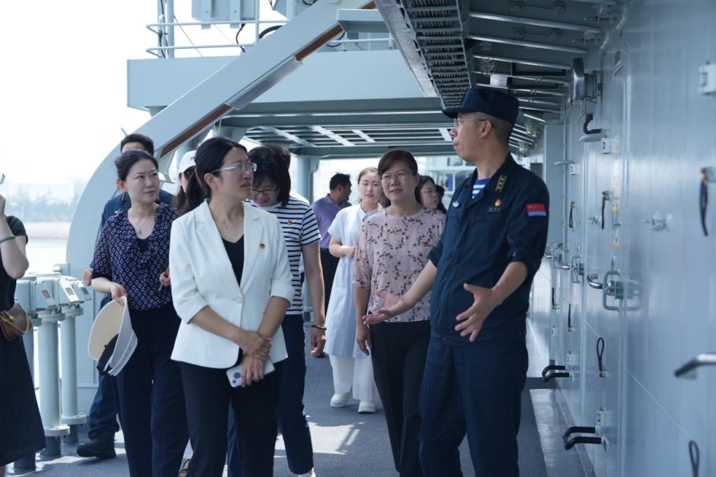 在舰领导的陪同讲解下,师生党员近距离接触驾驶室、手术室、阅览室等船舱内部设备装置,深切领会新时代海军“向战而行向海图强”的精神要义与战略内涵,饱览现役舰艇的雄伟风采。学生代表们演唱经典红歌《想家的时候》《红旗绣》,表达对舰艇官兵的崇高敬意。