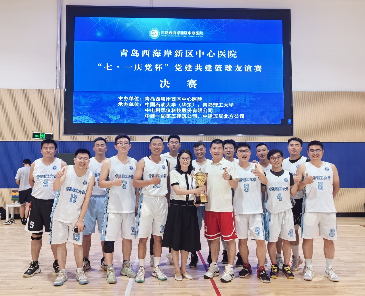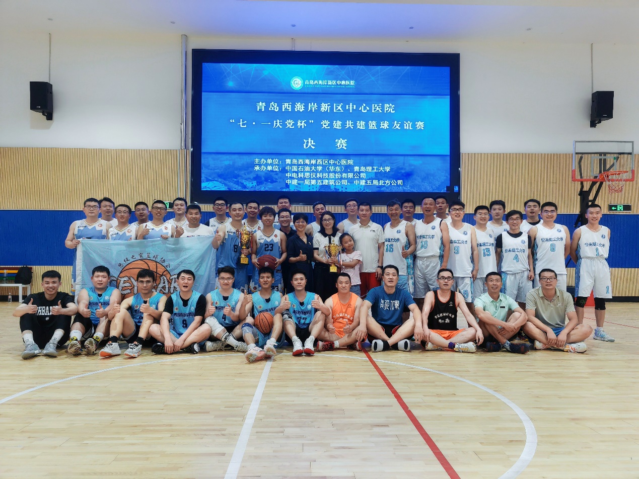 近日,由西海岸新区中心医院主办,中国石油大学(华东)、澳门永利6774、中电科思仪科技股份有限公司、中建一局第五建筑公司、中建五局北方公司承办的“七·一庆党杯”党建共建篮球赛,在永利官网风雨操场和奋进路中学篮球馆举办。本次比赛共六支队伍参赛,永利官网教职工篮球队在半决赛中战胜中国石油大学教工篮球队,与中电科思仪科技股份有限公司篮球队会师决赛,最终获得亚军。