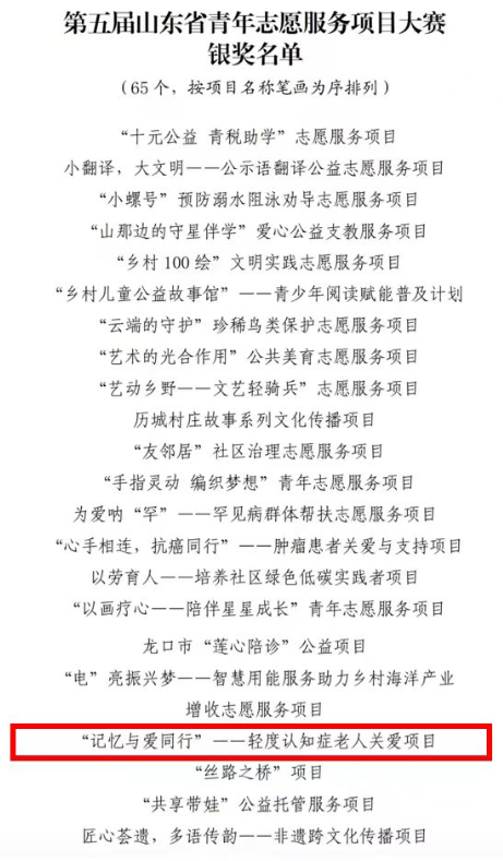 8月7日至9日,由共青团山东省委、山东省委社会工作部等12个单位联合主办,山东省青年志愿者协会、共青团枣庄市委等单位承办的第五届山东省青年志愿服务项目大赛暨志愿服务交流会在枣庄市举行。经过角逐,人文与外国语学院“记忆与爱同行—轻度认知症老人关爱项目”项目荣获第五届山东省青年志愿服务项目大赛银奖。
