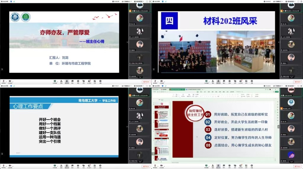 此次培训邀请了班主任工作经验丰富的专业课老师和教育管理专职老师进行专题分享,帮助新生班主任充实班级建设工作经验,肩负起培养时代新人的责任和使命。环境与市政工程学院教师刘龙分享了作为班主任从大一到大四不同阶段培育学生的经验方法,要以细致入微的观察、耐心贴心的陪伴、科学精心的专业指导赢得学生,以过硬本领帮助学生成长成才;土木工程学院教师王鹏刚从班风建设入手,讲述了开学第一课、班级活动、舍风建设对于塑造良好班风学风、提高考研率的重要作用;大学生心理中心主任刘安庆分别从大学生心理问题现状、产生原因、表现状态等,分享了“六个一”心理工作要点,为日后班主任工作中面对学生心理问题的防范与化解提供了科学、实用的举措;学生工作处副处长王振分享了丰富的班级管理和育人经验,启发广大班主任要具备强烈的事业心和责任感,从严治教、从严治学。